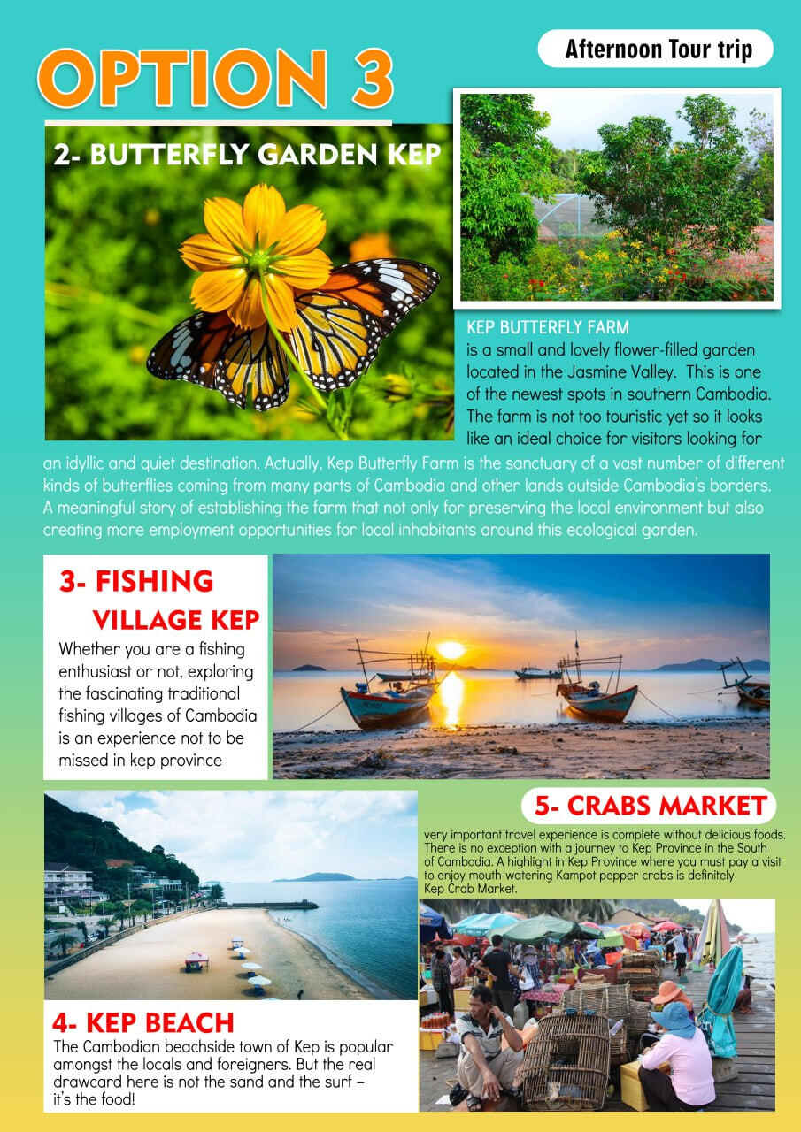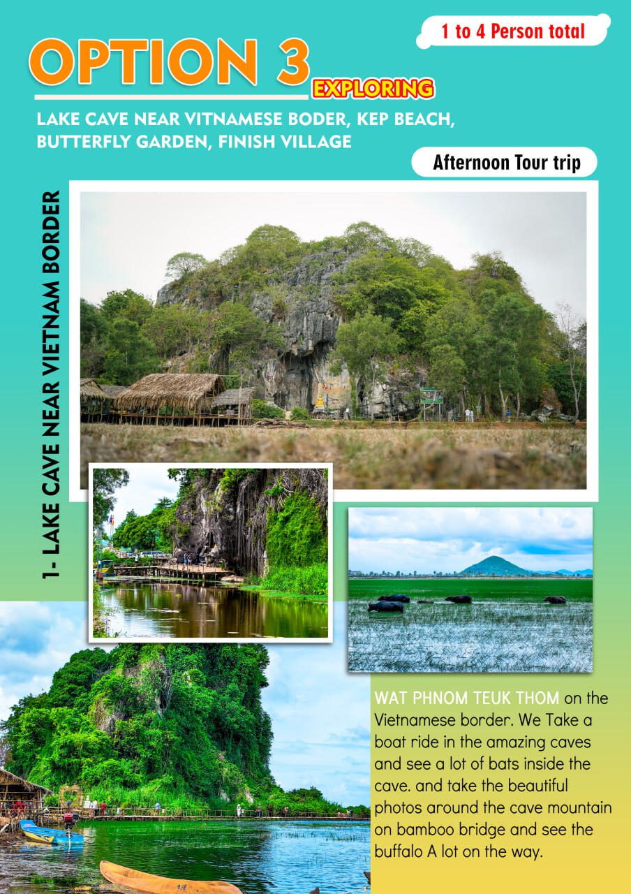 We will explore the Lake cave, near the Vietnamese border, Kep beach, Butterfly garden and fishing village afternoon Tour trip. Scroll further for more information!Time starts: pick up at the hotel at 1:15pm be back around sunset 🌇Including: cold water transportingdriver English speaking guide. We go with a private car 🚗 And you will not joining a group 🙏 💕Contact me about pricing depending on the vehicele etc.!
