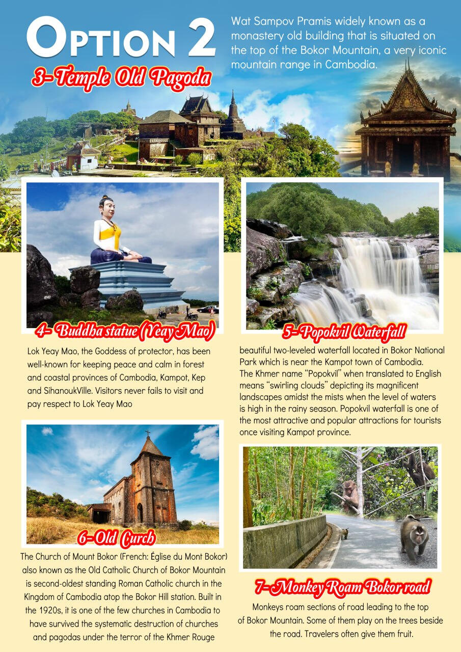 A hilltop haven of luxury and sublime hospitality, its journey has been an arduous one. After twists and turns through decades of war and uncertainty, it’s now a jewel on the Cambodian skyline.2. Black palaceDamnak Sla khmao was a lit-tle summer palace of the kings Sihanouk ;aban doned sometimes in thr last 1960 or early 1970.3. Temple old pagodaWat Sampov Pramis is widely known as a monastery old building that is situated on the top of the Bokor Mountain, a very iconic mountain range in Cambodia.4. Buddha statue ( Yeay Mao)Lok Yeay Mao, the Goddess of protector, has been well-known for keeping peace and calm in forest and coastal provinces of Cambodia, Kampot, Kep and Sihanouk Ville. Visitors never fails to visit and pay respect to Lok Yeay Mao5. Popokvil Waterfallbeautiful two-leveled waterfall located in Bokor National Park which is near the Kampot town of Cambodia. The Khmer name “Popokvil” when translated to English means “swirling clouds” depicting its magnificent landscapes amidst the mists when the level of waters is high in the rainy season. Popokvil waterfall is one of the most attractive and popular attractions for tourists once visiting Kampot province.6. Old churchThe Church of Mount Bokor (French: Église du Mont Bokor) also known as the Old Catholic Church of Bokor Mountain is second-oldest standing Roman Catholic church in the Kingdom of Cambodia atop the Bokor Hill station. Built in the 1920s, it is one of the few churches in Cambodia to have survived the systematic destruction of churches and pagodas under the terror of the Khmer Rouge.7. Monkey Roam Bokor roadMonkeys roam sections of road leading to the top of Bokor Mountain. Some of them play on the trees beside the road. Travelers often give them fruit.